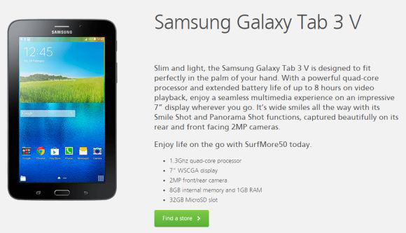 Untuk meningkatkan performa dari tablet yang di hasilkan oleh Samsung ini nantinya akan di dukung oleh prosessor ARM dengan Cortex A7 berteknologi Quad Core yang mampu berlari dengan kecepatan maksimum sekitar 1.2 GHz, selain itu kinerja tablet ini juga di songkong dengan memori RAM yang berukuran cukup besar, hingga 1 GB yang mampu meningkatkan performa yang dapat di hasilkan oleh Samsung tersebut, sehingga tablet ini terbilang sangat lumayan pada kelas tablet entry level-nya. Dengan layar tablet yang berukuran sekitar 7 inch, dan dengan resolusi pendukungnya yang ada di bagian tampilan layar sekitar 1024×600 pixel, dengan density di setiap inchinya sampai 170 pixels menjadikan tablet ini semakin ciamik. Sedangkan jika dilihat dari sektor kameranya, tablet ini memang masih tergolong standar, sebab tablet ini masih membenamkan resolusi kamera sekitar 2 MP pada bagian belakang dan depannya. Nah, ini dia tabel spesifikasi Samsung Galaxy Tab 3V, simak selengkapnya. 🙂